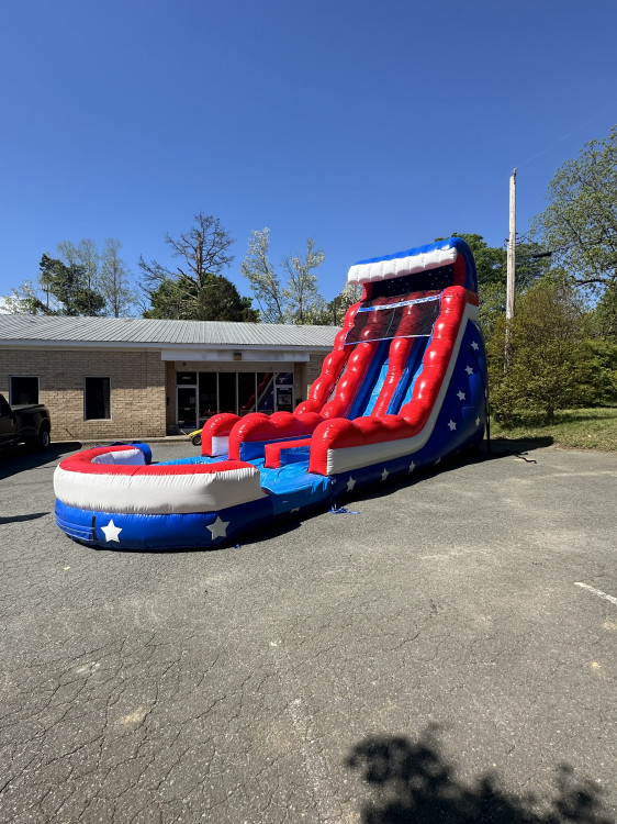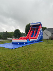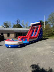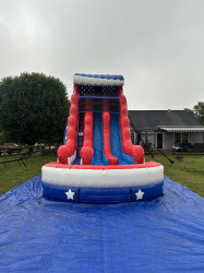 22 Ft Stars & Stripes double lane EZ Inflatables Water Slide. It’s a perfect option for any event where folks want to cool off and have some adrenaline-pumping fun.